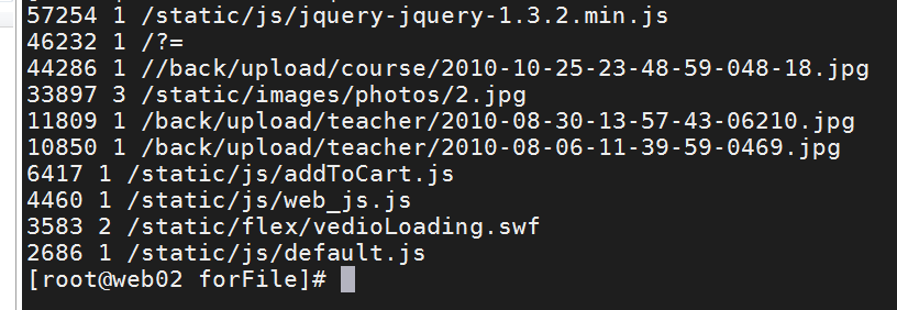 最终结果是某个文件的访问次数和消耗的流量,所以考虑建立以文件名为索引的两个数组,一个存储访问次数,一个保存消耗的流量,这样当使用awk按行遍历文件时,对次数数组+1,同时对流量数组进行文件大小的累加,等文件扫描完成。再遍历输出两个数组既可以得到该文件的反间次数和总的流量消耗。 #{array_num[$7]++ 数组第七列的,只要出现一次相同的文件名那就++ , 这个就相当于访问次数了#arrzy_size[$7]+=$10 ,把第七列相同的,将后面的$10进行加和。 相当于总访问量 awk '{array_num[$7]++;array_size[$7]+=$10}END{for(x in array_num){print array_size[x],array_num[x],x}}' log.txt | sort -nr -k1 | head -n 10
